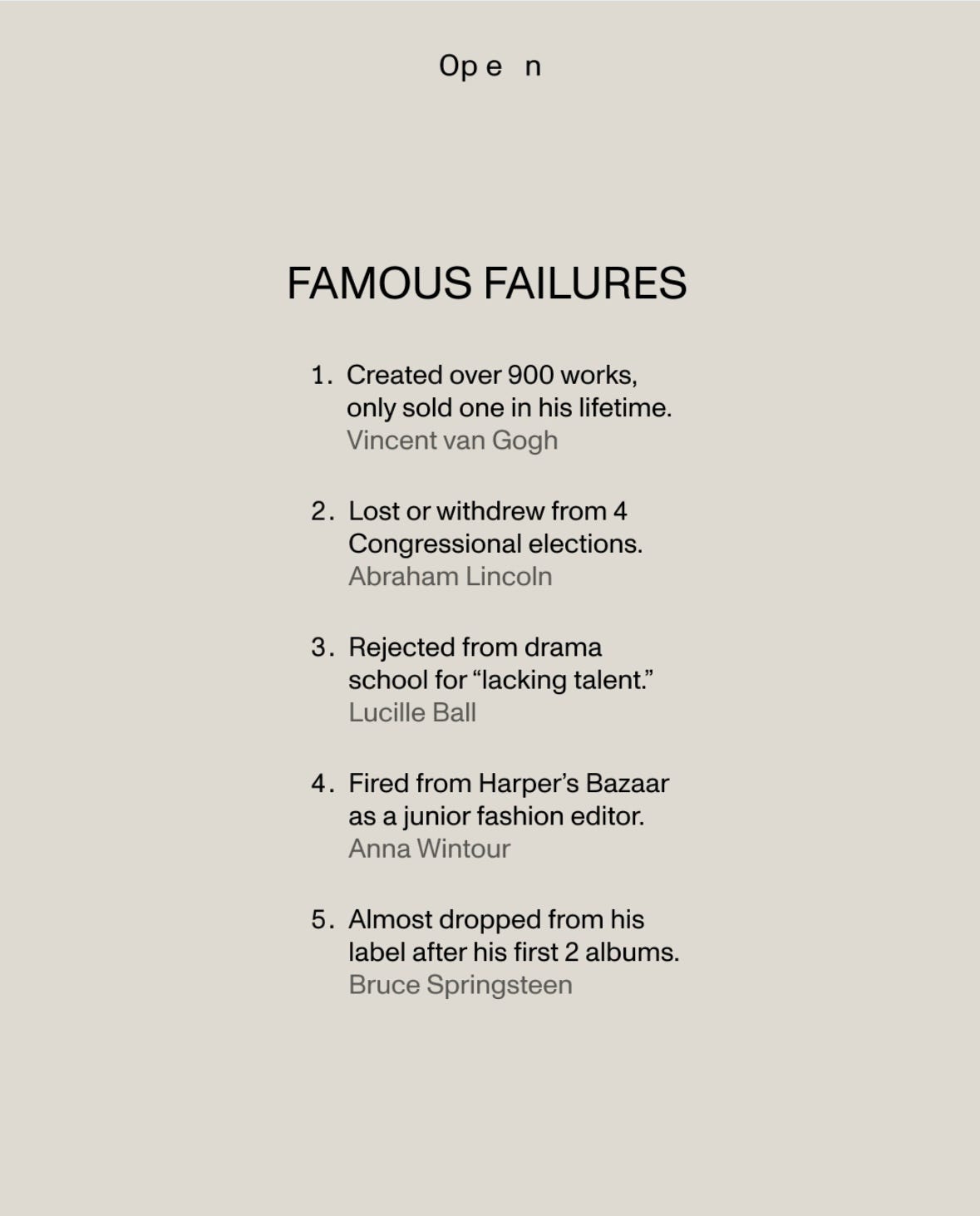 Twyla Tharp, a storied choreographer who has spent decades manipulating form and making us feel describes the creative process as a habit. A practice. The more we create, the more failure we can expect because that's a natural part of experimentation. If you look at your work as a long game, a 70 year career like Twyla, what is one, two, or ten failures in the midst of that timeline? It’s a blip.